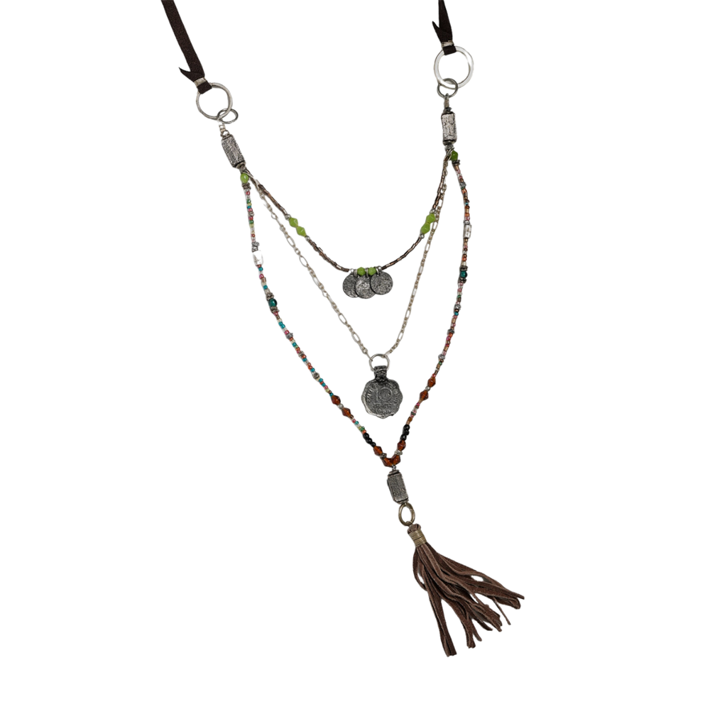Add a touch of free-spirited charm with the Boho Tassel Necklace, handmade by Village Artisans in India. Featuring layered strands of colorful beads, antique-style coins, and a playful tassel, this necklace blends earthy tones with eclectic style. Each piece reflects the artistry and tradition of its maker, creating a look that is truly one-of-a-kind.