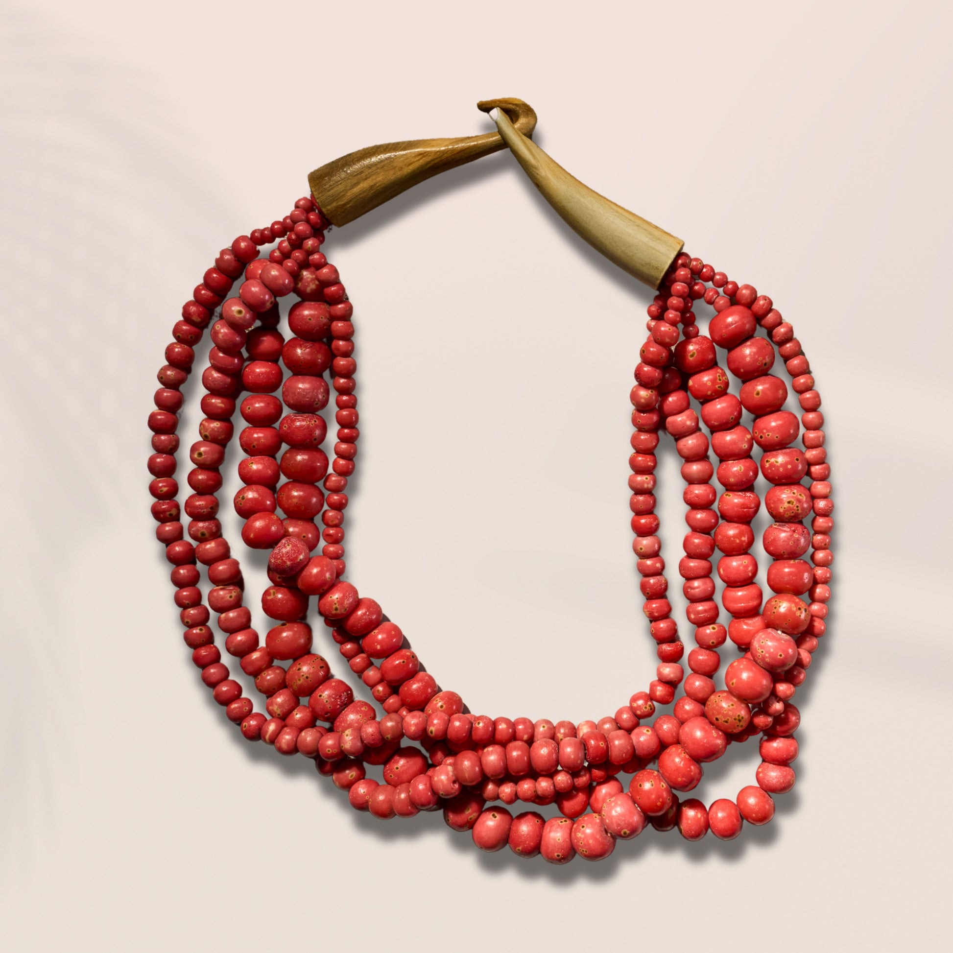 Make a bold statement with the Tribal Meets Regal Necklace, handmade by Village Artisans in India. Featuring multiple strands of vibrant coral-toned beads anchored with smooth wooden accents, this piece blends earthy textures with regal elegance. Its layered design adds both depth and drama, making it a stunning accessory for any occasion.