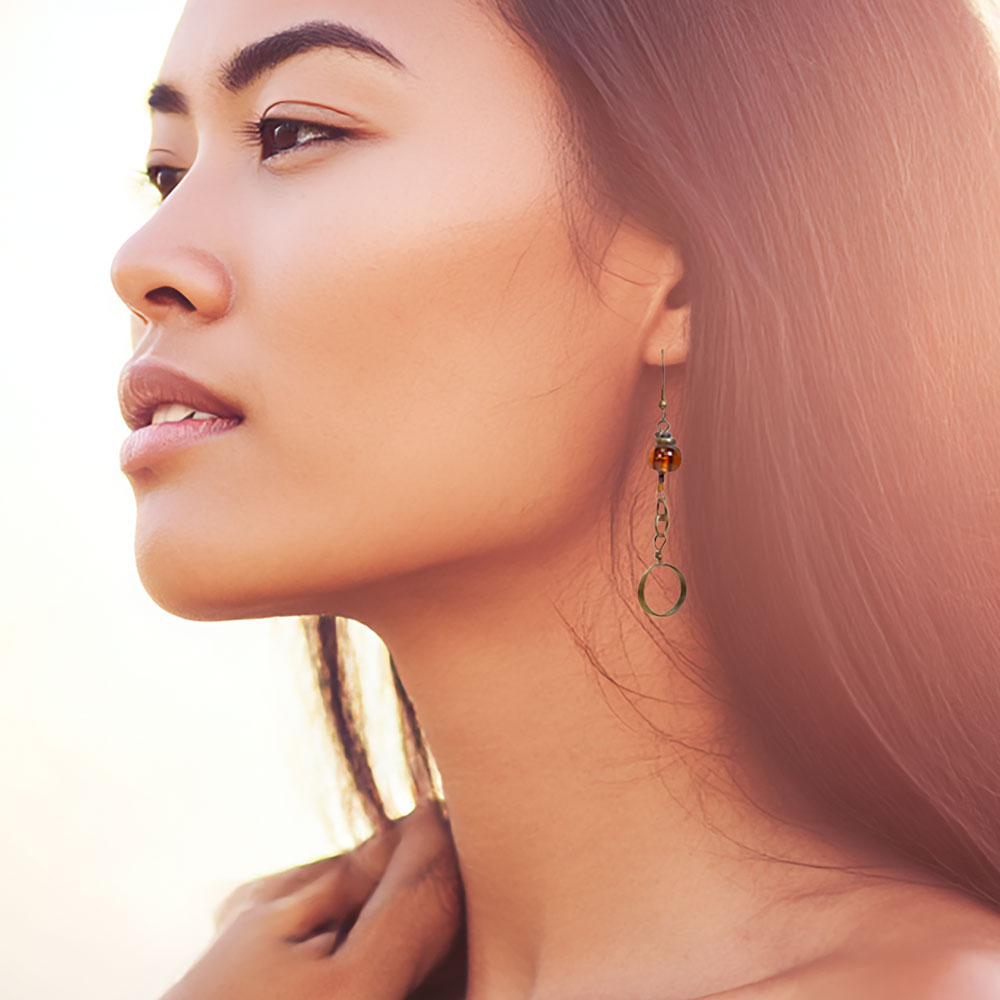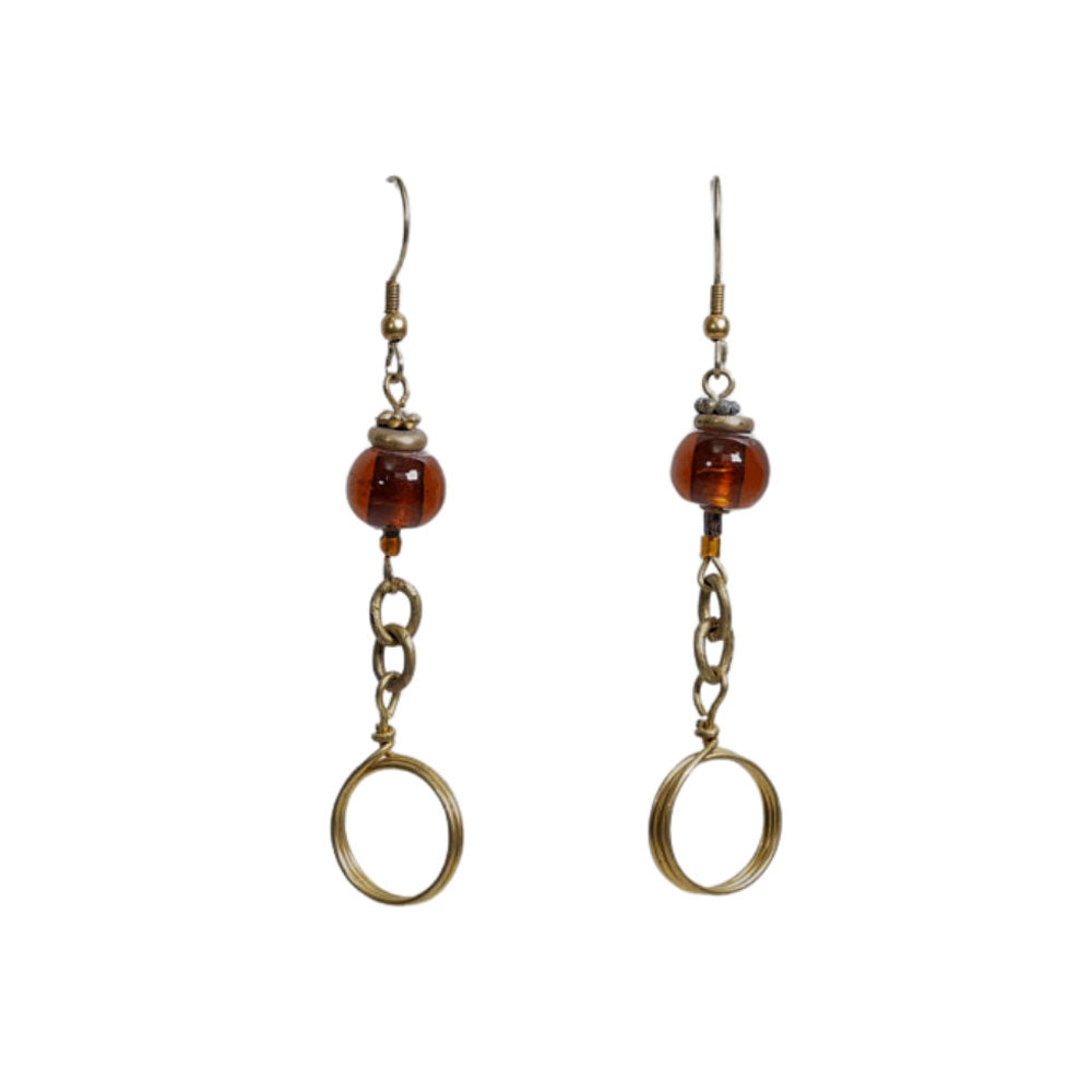 Bring a touch of warmth and elegance to your look with the Warm Earrings. Featuring a rich amber-toned bead paired with antique brass chain links and a graceful circular charm, these earrings offer a perfect balance of rustic beauty and modern design.
